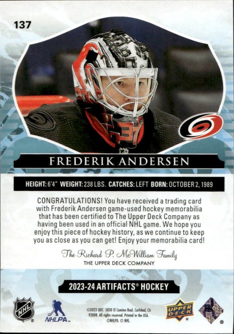 2023-24 Upper Deck Artifacts Hockey - Base - Duel Patch /149 #137 Frederik Andersen - Carolina Hurricanes