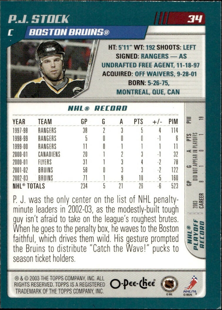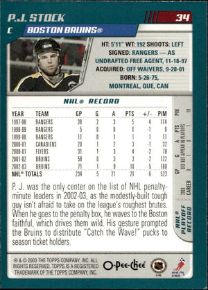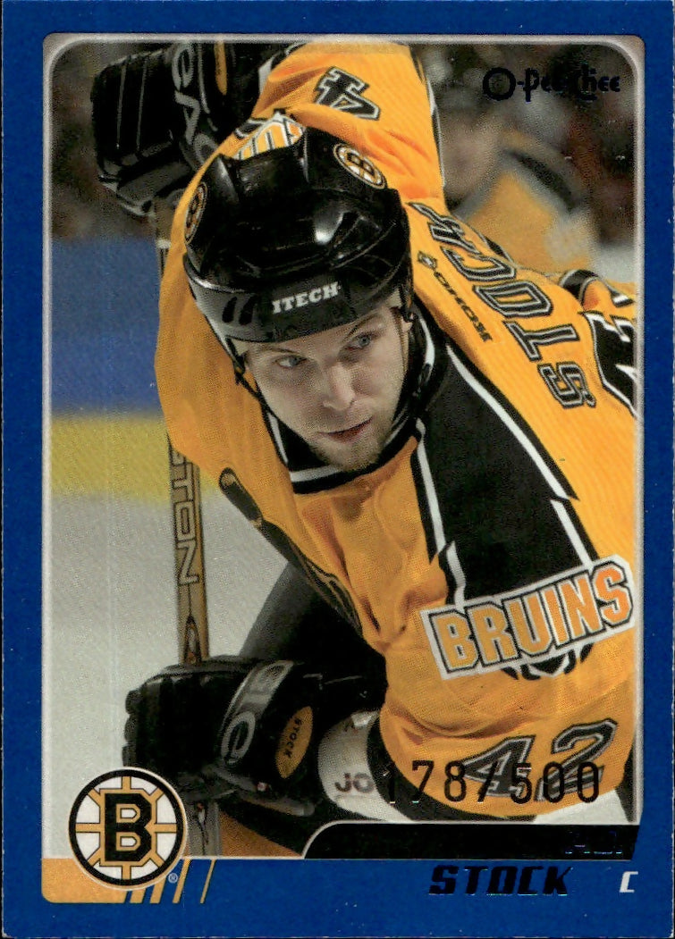 2003-04 O-Pee-Chee - Base - Blue /500 #34 P.J. Stock - Boston Bruins