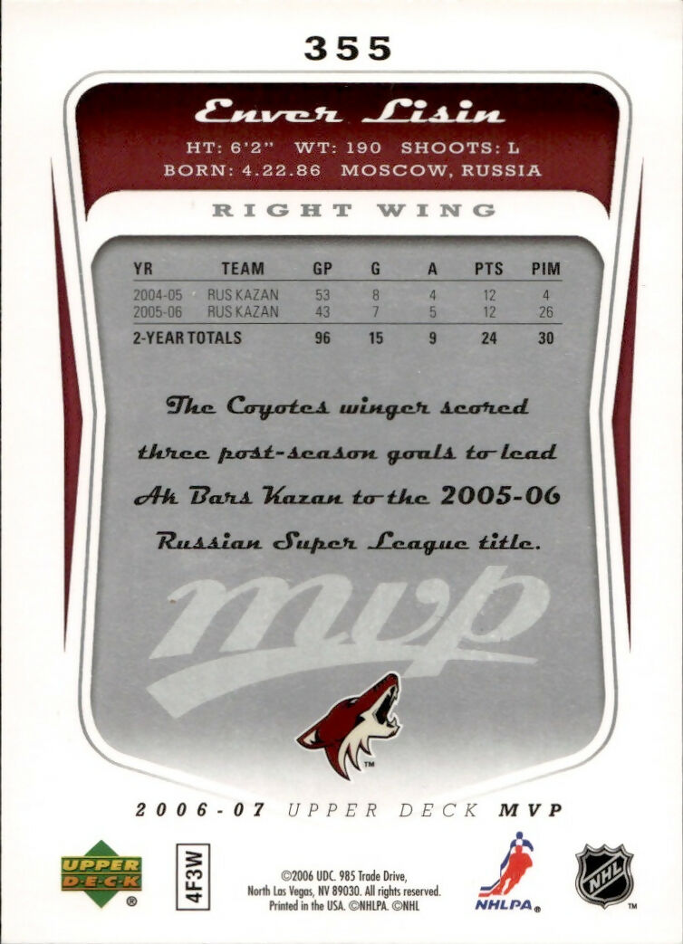 2006-07 Upper Deck MVP Hockey - Rookie Base #355 Enver Lisin - Phoenix Coyotes