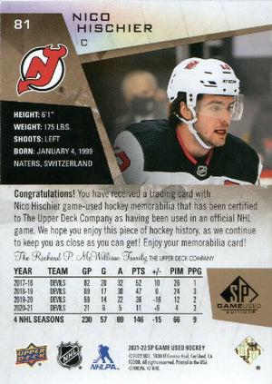 2021-22 Upper Deck SP Game Used Hockey - Base - Gold Premium Memrabilia :15 81 Nico Hischier - New Jersey Devils - B